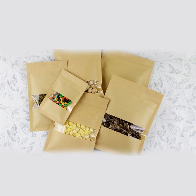 100 stuks Platte Bruin Kraft Papieren Zakken Voor /snoep/thee/voedsel/bruiloft Met Venster Geen stand Up Rits Kraft Zakken Ambachten Verpakking Zak