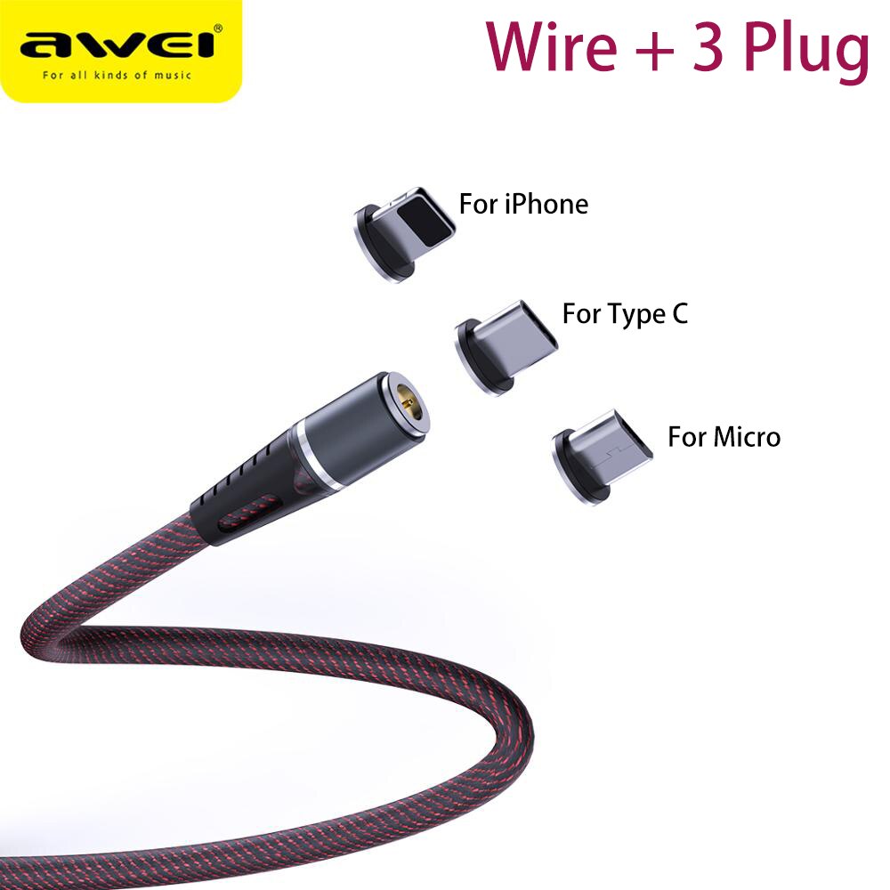 Awei led magnetische kabel 3 in 1 oplaadkabel snel 360 graden type c usb-kabel micro usb magnetische oplader snel voor mobiele telefoon