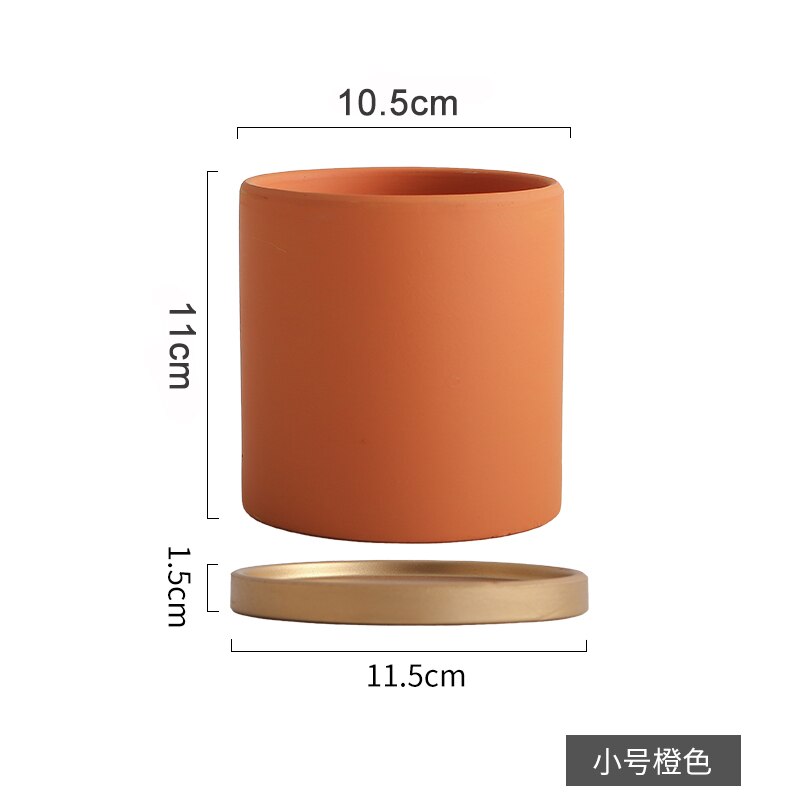 Eenvoudige, rechte, kleurrijke, cilindrische, keramische bloempot in europese stijl, vetplanten, bloemen, groene dillepot met gouden schaal